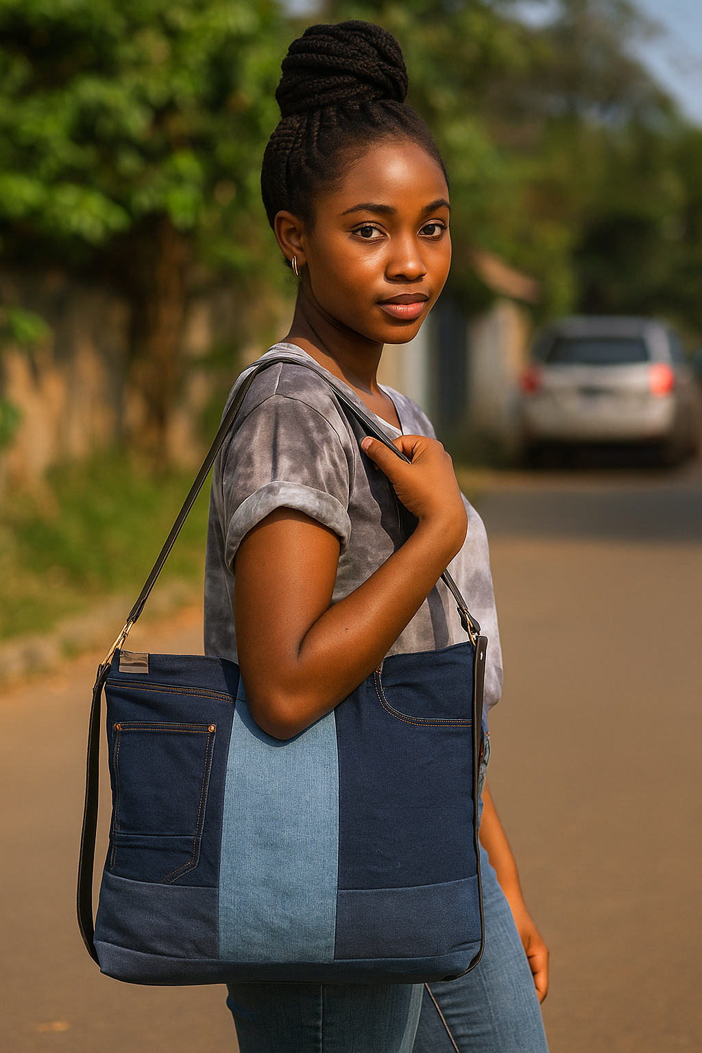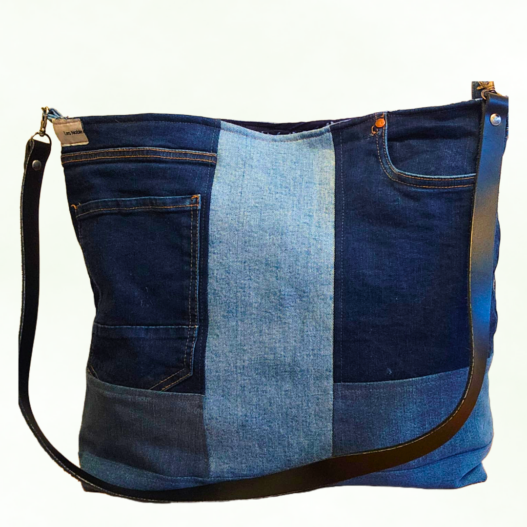 Carry sustainability in style with this Upcycled Denim Patchwork Shoulder Bag — a perfect blend of fashion, function, and eco-conscious design. Handcrafted from repurposed denim in varying shades of blue, this bag celebrates the beauty of individuality and responsible craftsmanship. Each panel tells its own story, featuring original jean pockets for extra utility and character. The spacious interior makes it ideal for daily use — whether you're heading to work, class, or a weekend outing. Finished with a durable adjustable leather strap and sturdy stitching, this bag is built to last while adding a unique touch to any outfit. Features: Made from 100% upcycled denim Unique patchwork design — no two bags are exactly alike Functional front pockets from original jeans Adjustable genuine leather strap for versatile carrying Secure zip closure Dimensions: [Add dimensions here] Style tip: Pair it with casual denim or neutral tones for a coordinated, effortlessly chic look.