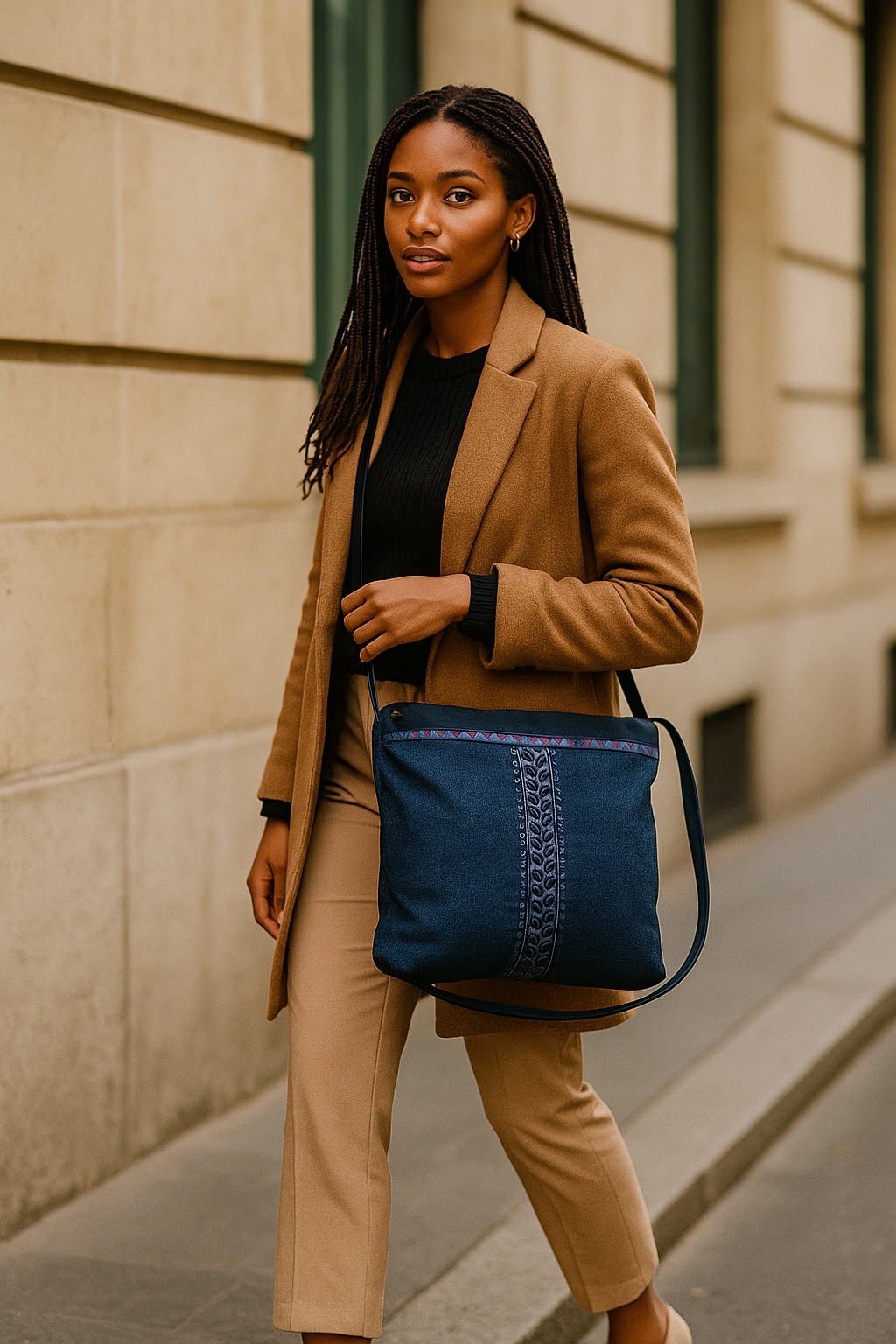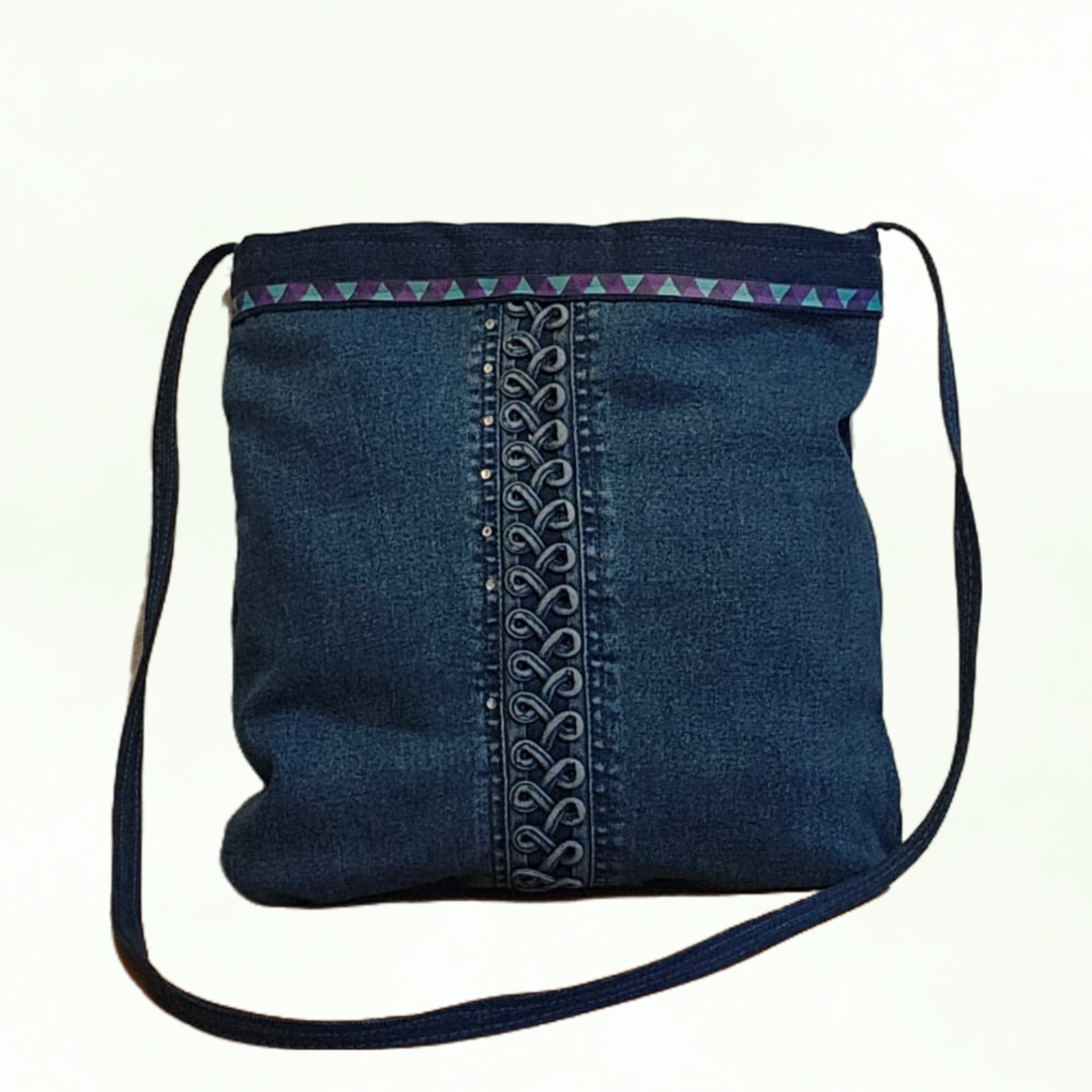 Add a touch of artistry to your everyday style with this Embroidered Upcycled Denim Crossbody Bag. Crafted from repurposed denim, this eco-friendly piece combines sustainable design with refined details. The front panel features an elegant embroidered lace-like pattern running vertically down the center, adding texture and sophistication. A strip of geometric trim in shades of purple and teal accents the top edge, giving the bag a vibrant, bohemian flair. Lightweight yet durable, it’s perfect for carrying your daily essentials while making a sustainable statement. Features: Made from 100% upcycled denim Decorative embroidered and geometric detailing Long, comfortable shoulder strap for hands-free use Soft yet sturdy construction Secure top closure
