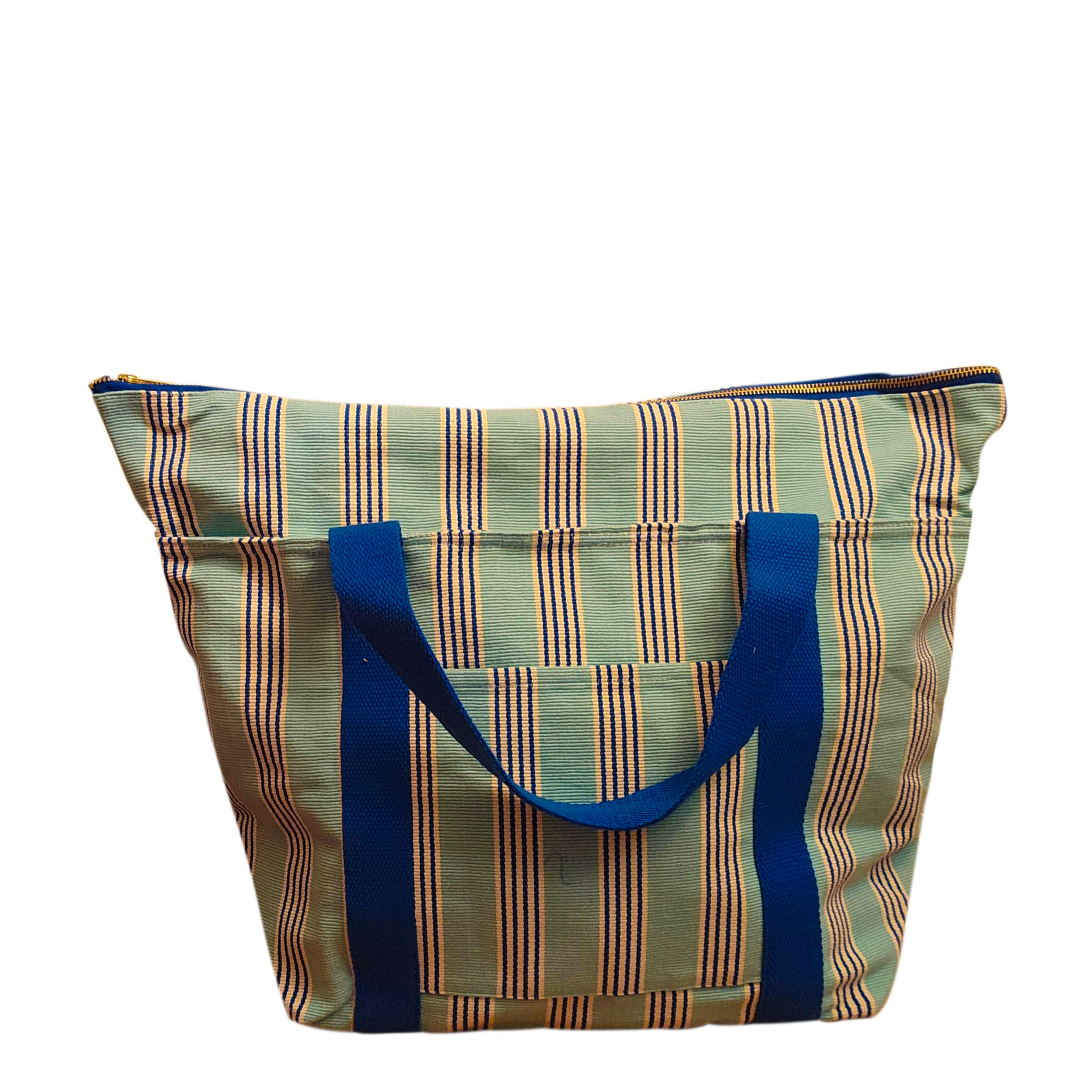 Add a touch of elegance to your routine with this beautifully crafted striped tote bag. Designed with a soft yet durable woven fabric, it features a charming vertical stripe pattern in calm, earthy tones, paired with bold blue straps for a striking contrast. The spacious main compartment offers plenty of room for essentials—perfect for work, weekend outings, or errands. Strong handles ensure comfortable carrying, while the quality stitching guarantees long-lasting use. A perfect blend of style, convenience, and reliability.