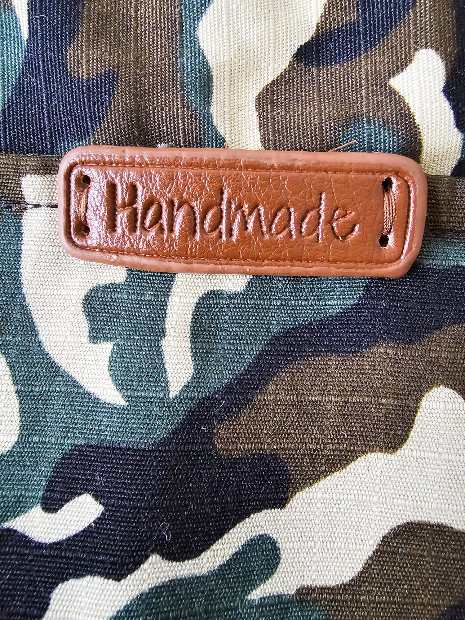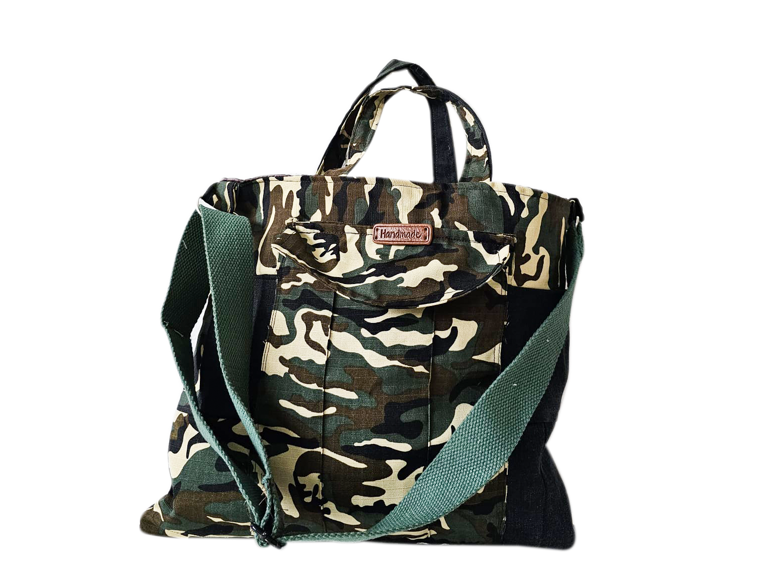 Handcrafted with a unique mix of camo-print fabric and upcycled black denim, this tote bag is designed for people who love practical fashion with character. The front features a stylish denim pocket repurposed from jeans, adding both charm and convenient storage for small essentials like keys, cards, or earphones. The bag comes with dual carrying options — sturdy camo-patterned hand straps and a comfortable green woven shoulder strap, making it perfect for work, school, shopping, or casual outings. Its spacious interior offers enough room for your laptop, books, groceries, or daily necessities. Whether you're looking for a durable everyday bag or a standout fashion piece, this tote combines sustainability with creativity, giving you a look that’s modern, rugged, and effortlessly cool. Key Features Premium camo and denim mix for a stylish, urban look Upcycled materials for an eco-friendly, sustainable choice Front denim pocket for quick-access storage Comfortable long shoulder strap + hand straps Strong stitching for long-lasting durability Spacious interior ideal for daily use